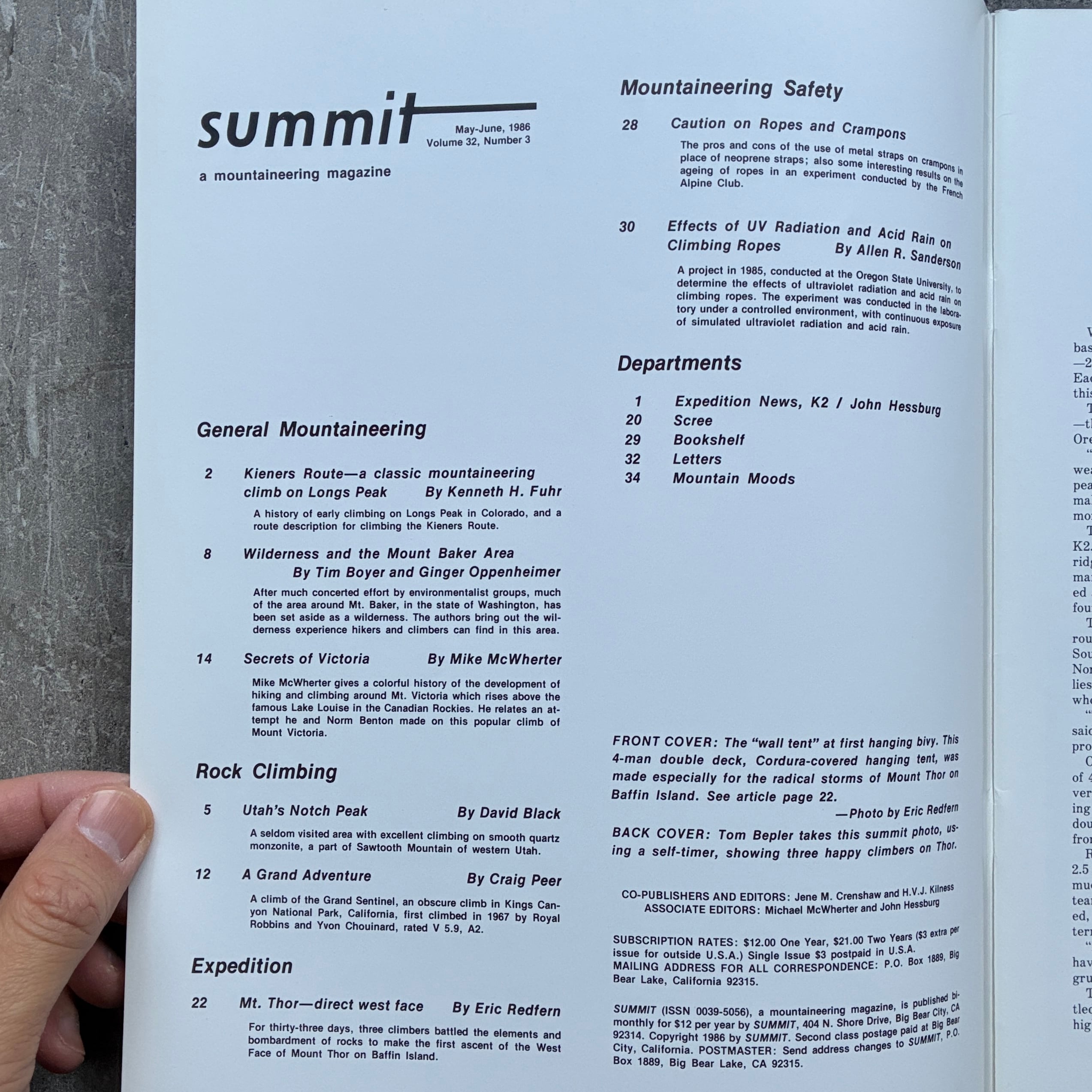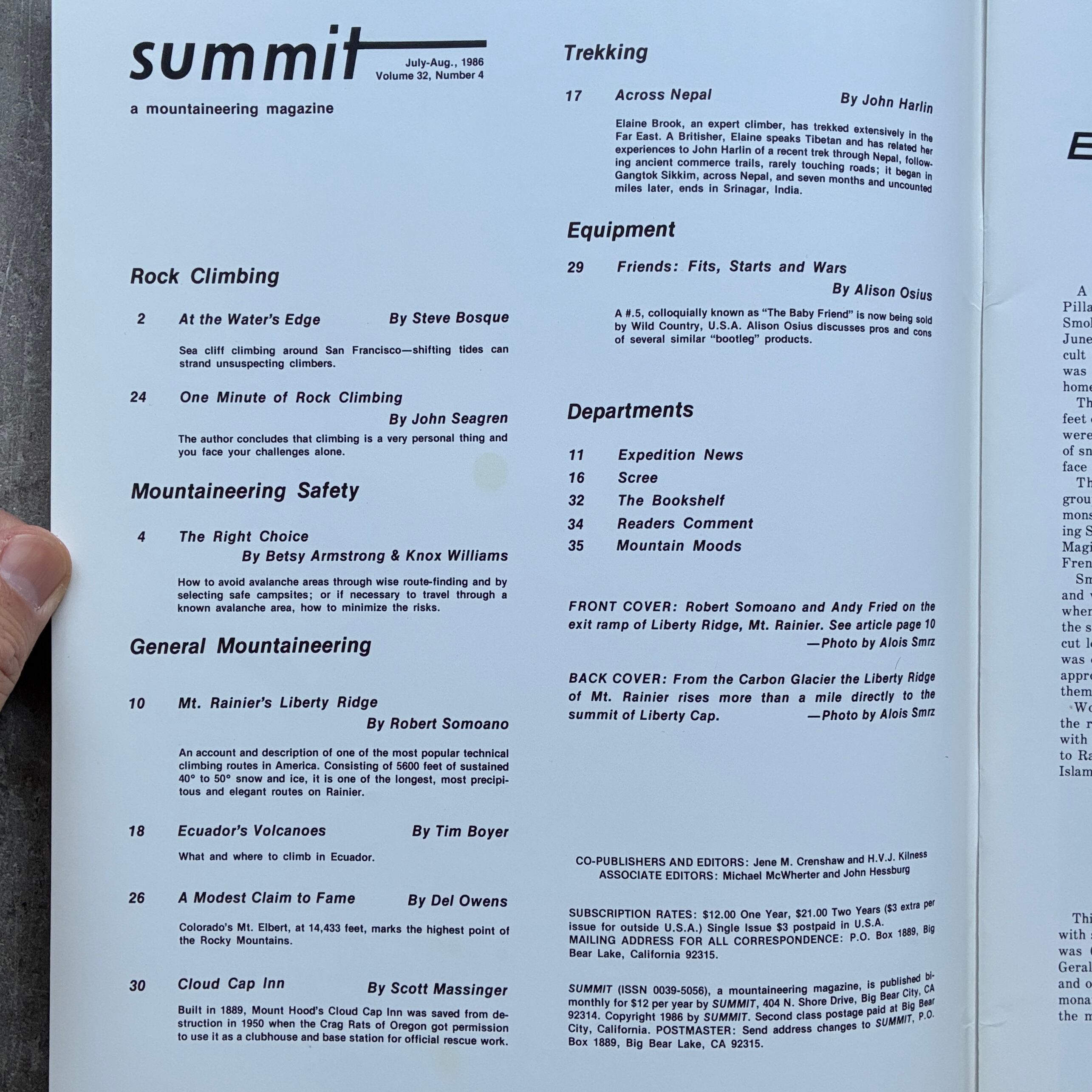 David Roberts served as the Rocky Mountain editor for a time, and Royal Robbins spent decades as the rock climbing editor. The list of illustrious climbers that wrote for or were featured in Summit during Jean and Helen's 35 year tenure is a veritable who's who of 20th century American climbing: Yvon Chouinard, Fred Beckey, Alrene Blum, Galen Rowell, Layton Kor. The list goes on and on.