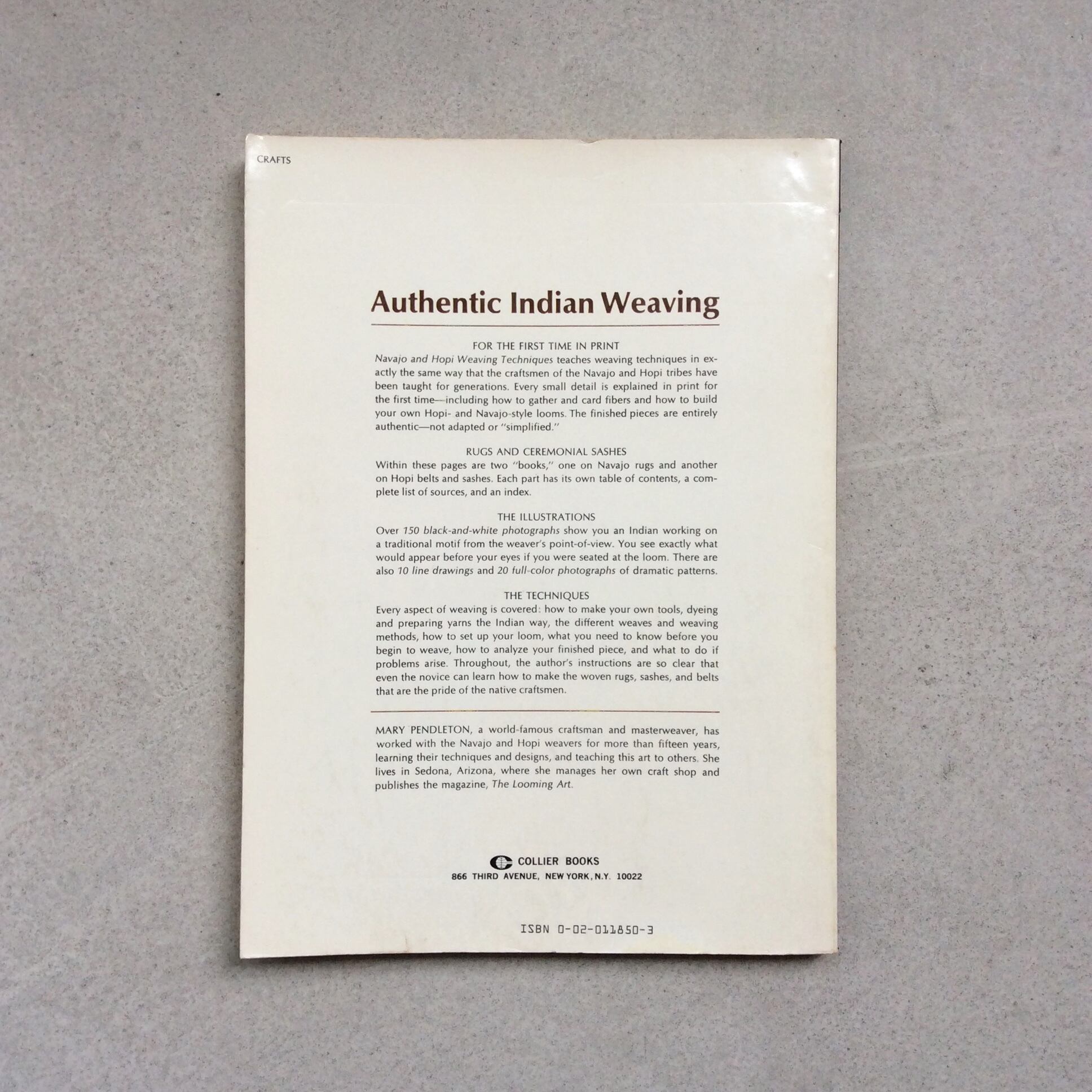Technically, though not in beauty of spirit, Mary Pendleton’s book replaces Working with the Wool as the best beginning Navajo rug weaving book. Years of teaching experience back the clearly-stated, efficient instructions for carding, spinning, dyeing yarns and warping, weaving and correcting common mistakes. Each step is photographed clearly. Also included are sections on loom building, Hopi methods of belt weaving, sash weaving and spinning, and suppliers’ lists. So, experienced or no, buy the materials and you’re into it!