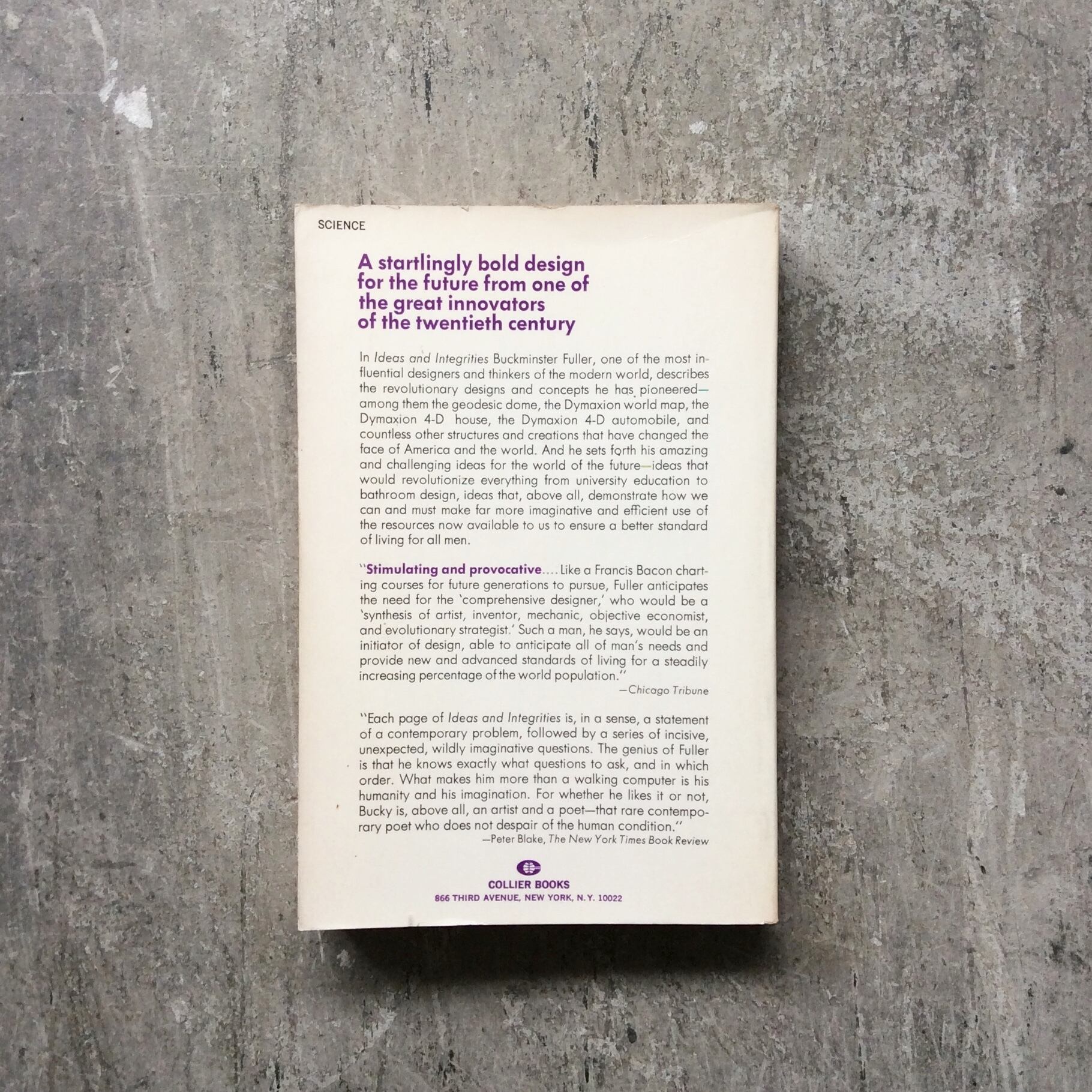 In Ideas and Integrities Buckminster Fuller describes the revolutionary designs and concepts he has pioneered – among them the geodesic dome, the Dymaxion world map, the Dymaxion 4-D house, the Dymaxion 4-D automobile, and the countless other structures and creations that have changed the face of America and the world. And he sets forth his amazing and challenging ideas for the world of the future – ideas that would revolutionize everything from university education to bathroom design, ideas that, above all, demonstrate how we can and must make far more imaginative and efficient use of the resources now available to us to ensure a better standard of living for all men.