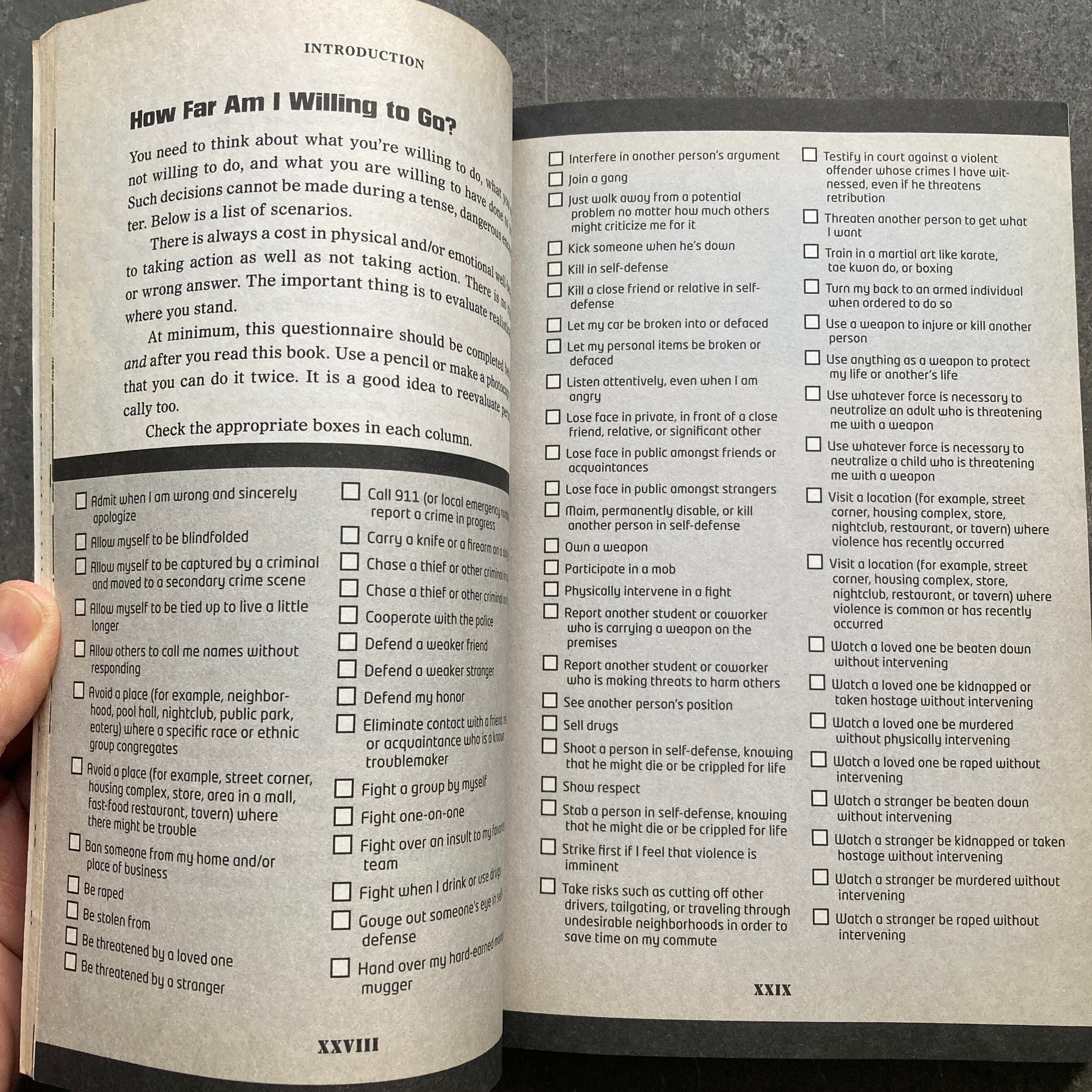 The authors also go into detail explaining how to recognize the first signs of a situation that could escalate into a fight and what to do. Only after they’ve convinced you to avoid a fight do they get to the section about effective ways of defending yourself.